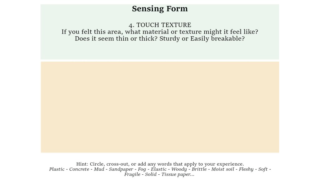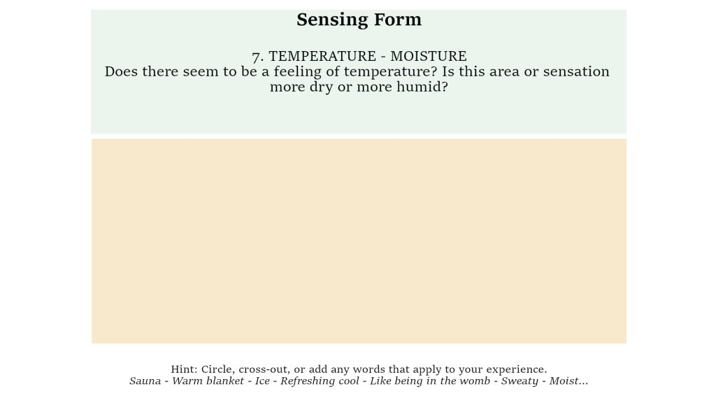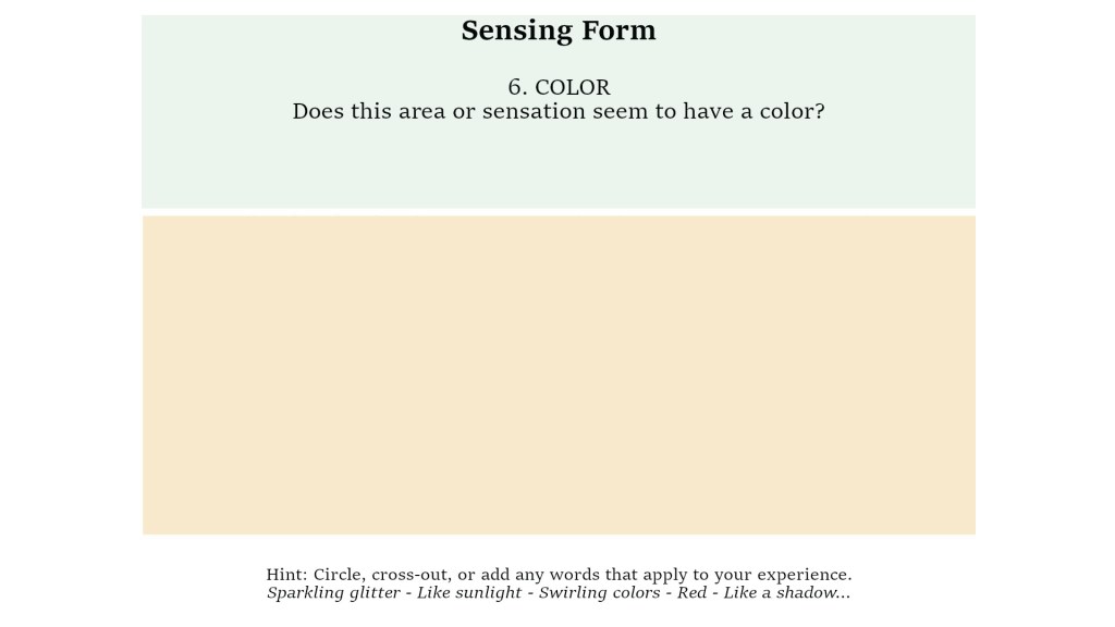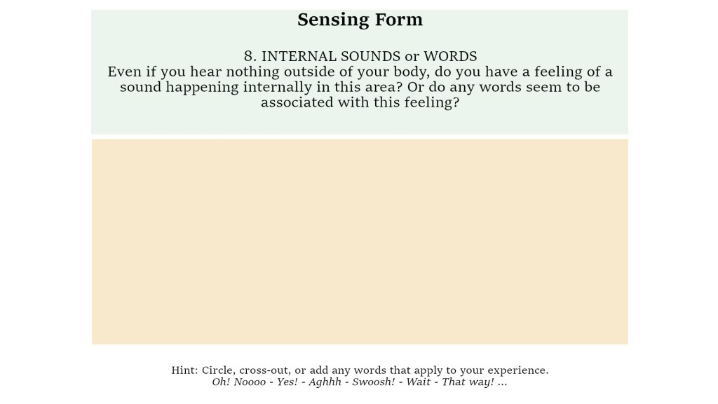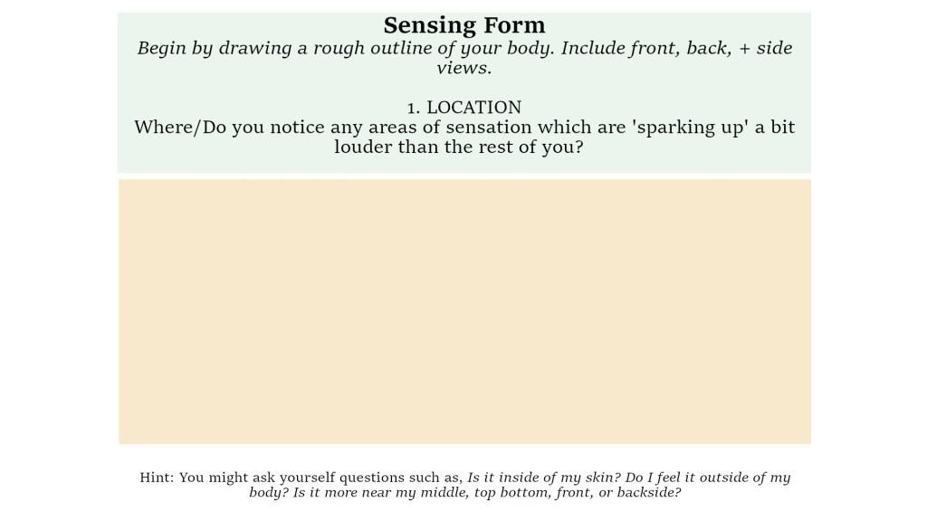 The last step of this Sensing Form has space to re-engage with thinking, meaning, epiphanies, vague noticings, and so forth.